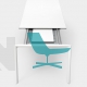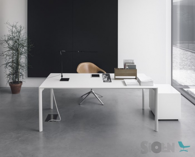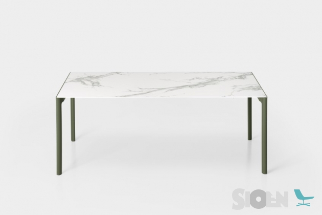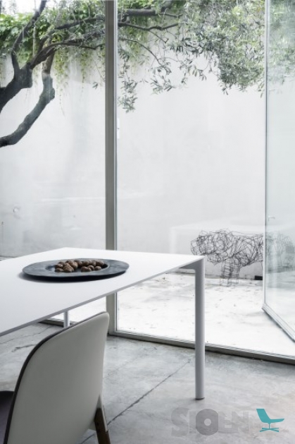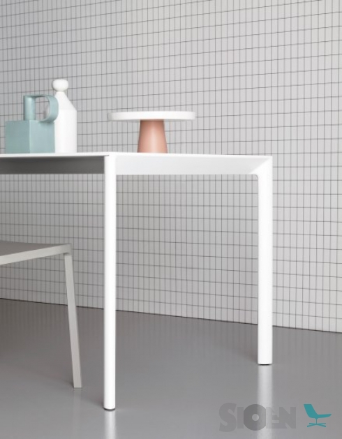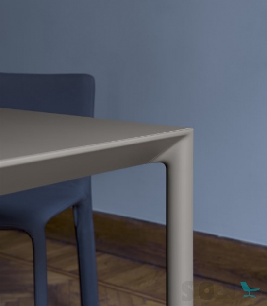 Maki, een tafel opnieuw geïnspireerd door de pure eenvoud van oosterse stijl, waarbij het been- en topprofiel soepel afgerond zijn randen. Maki is verkrijgbaar in verschillende maten en kleuren, waardoor een groot aantal esthetische en functionele oplossingen mogelijk is. De poten zijn gemaakt van gegoten aluminium, terwijl de bovenkant verkrijgbaar is in Alucompact en Pure-witte laminaten, Fenix-NTM, DEKTON van Cosentino en glanzend of mat glas.