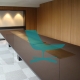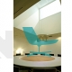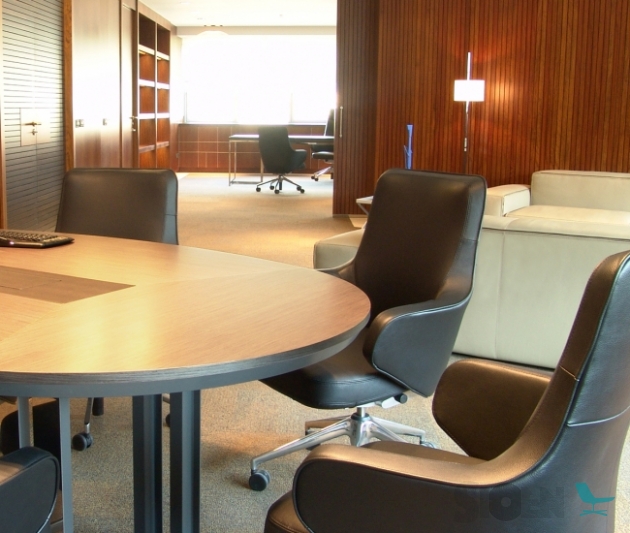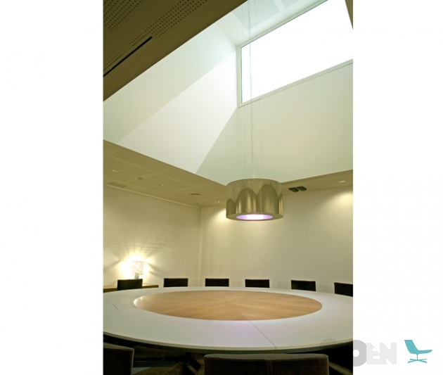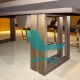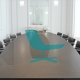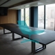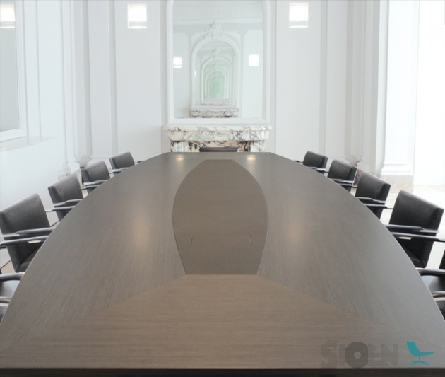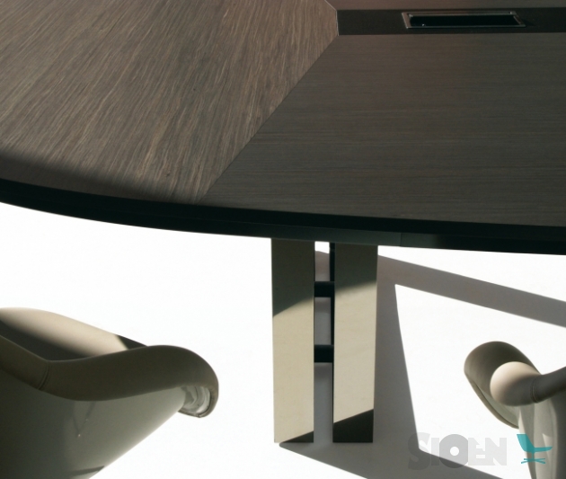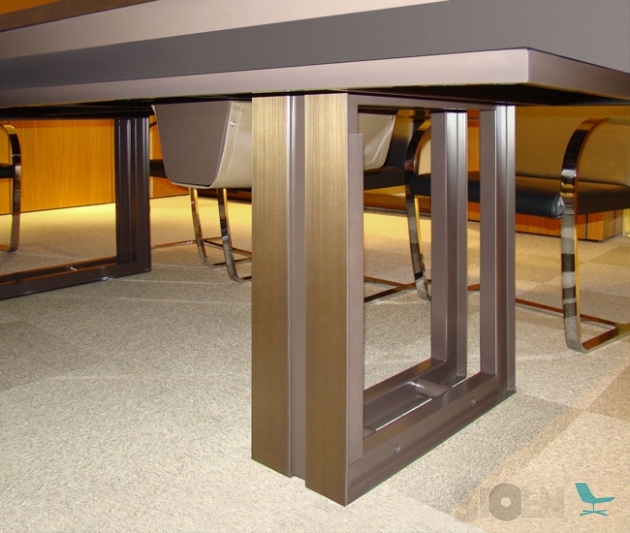 Tafel met vier stuks top en een centrale textiel-leer omgeving. Onder top gelakt in getextureerde grafiet. Metalen structuur basis, gelakt in getexturiseerde grafiet en fronten in staal. Aangepaste afmetigen.