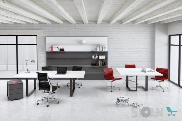 De dragende structuur bestaat uit metalen poten met een epoxy afwerking of gepolijst geborsteld. De poten zijn verkrijgbaar in drie uitvoeringen: ringvormig, T-vormig en L-vormig. De bovenbladen zijn verkrijgbaar in houtfineer of Italiaans melamine, in aan de achterzijde gelakt glas (ook in de antivinger versie), leer en porseleinen tegels, omlijst door een aluminium profiel.